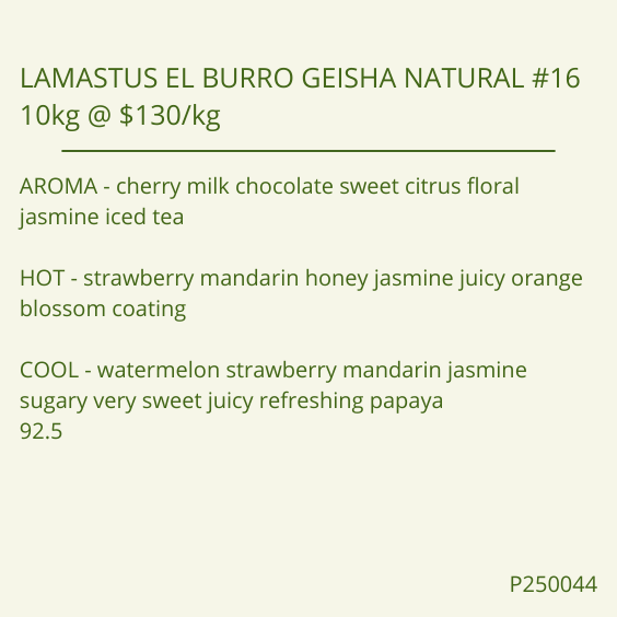 LAMASTUS EL BURRO GEISHA NATURAL LOT #16 1kg @ $160/kg