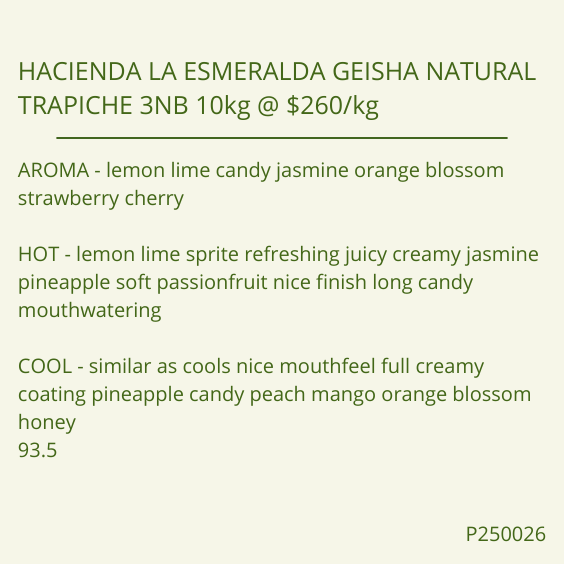 HACIENDA LA ESMERALDA GEISHA NATURAL TRAPICHE 3NB 10kg @ $260/kgOut of stock