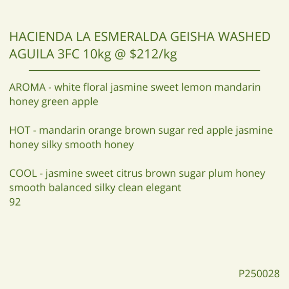 HACIENDA LA ESMERALDA GEISHA WASHED AGUILA 4AFC 10kg @ $212/kgOut of stock