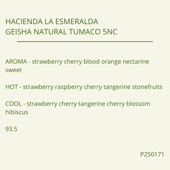 HACIENDA LA ESMERALDA GEISHA NATURAL TUMACO 5NC 10kg @ $300/kgOut of stock