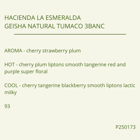 HACIENDA LA ESMERALDA GEISHA NATURAL TUMACO 3BANC 10kg @ $360/kgOut of stock