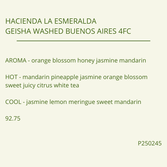 HACIENDA LA ESMERALDA GEISHA WASHED BUENOS AIRES 4FC 6kg @ $250/kgOut of stock