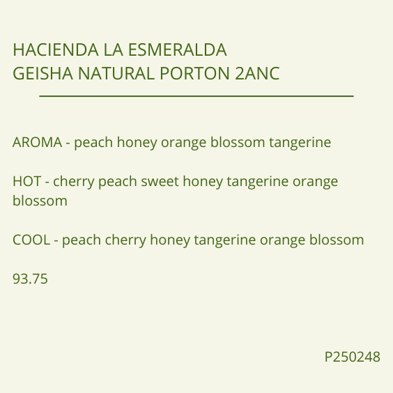 HACIENDA LA ESMERALDA GEISHA NATURAL PORTON 2ANC 8kg @ $300/kgOut of stock